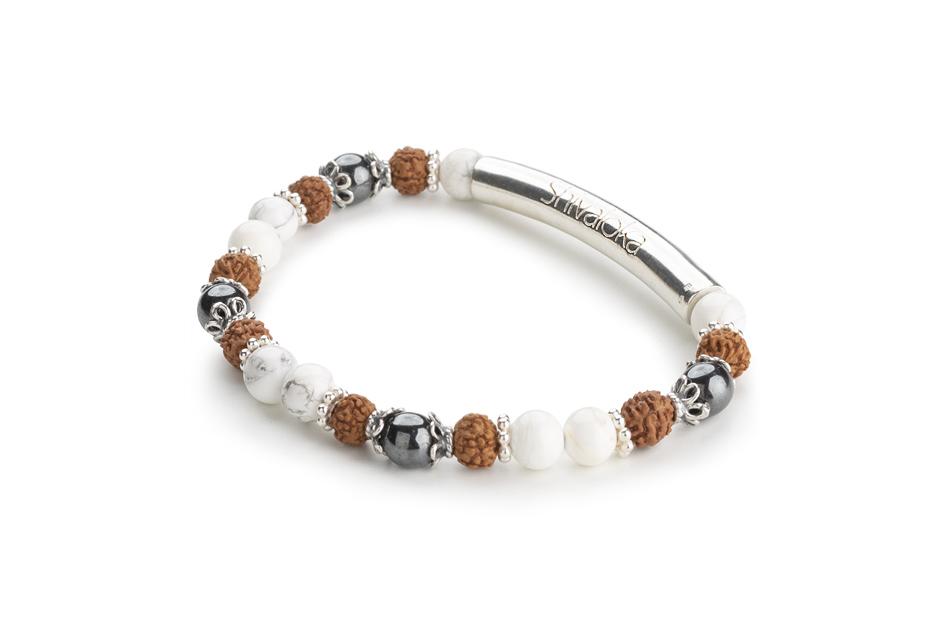 Náramek z Rudrakshi, magnezitu a hematitu se stříbrnými komponenty přirozeně souzní s jeho nositelem jako výdech s nádechem. Semeno Rudrakshi jakožto modlitební korálek v sobě odráží pozitivní energii a přenáší její působení na nositele šperku. Magnezit osvětluje vnitřní myšlenky, je jakýmsi zrcadlem nitra. Hematit přináší rovnováhu a ochranu. Hmotný svět začíná nádechem a končí výdechem.