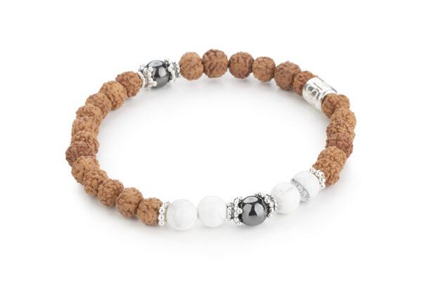 Náramek z Rudrakshi, magnezitu a hematitu se stříbrnými komponenty přirozeně souzní s jeho nositelem jako výdech s nádechem. Semeno Rudrakshi jakožto modlitební korálek v sobě odráží pozitivní energii a přenáší její působení na nositele šperku. Magnezit osvětluje vnitřní myšlenky, je jakýmsi zrcadlem nitra. Hematit přináší rovnováhu a ochranu. Hmotný svět začíná nádechem a končí výdechem.