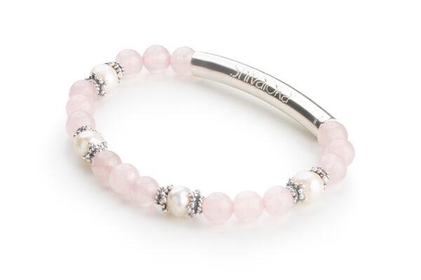 Náramek z růženínu, perly a stříbra podtrhuje ženskost v její nejčistší podstatě. Růženín je symbolem lásky, krásy a uzdravování. Perla odráží jedinečnost a půvab každé ženy. Spojení těchto minerálů vytváří jemnou eleganci, která vyzdvihuje dívku, ženu.