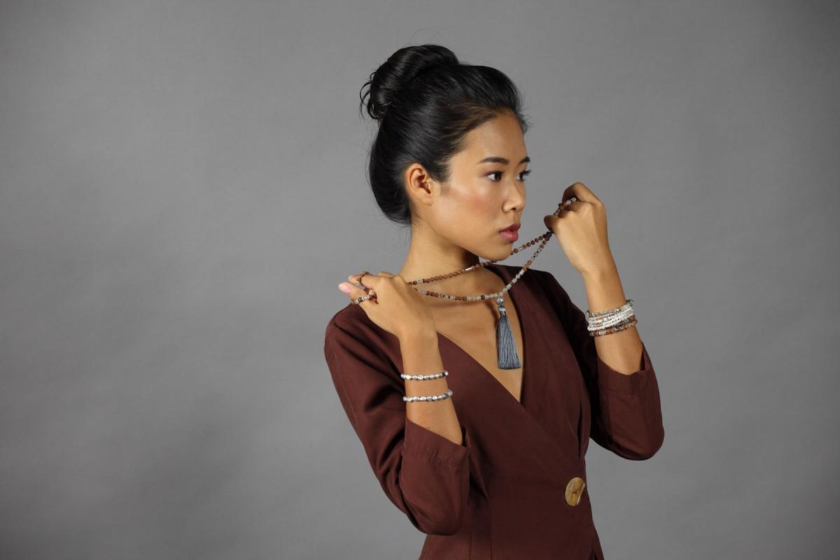 Spirituální set náramku a maly z Rudrakshi, cordieritu a černého rutilu přirozeně souzní s jeho nositelem jako nádech s výdechem. Hmotný svět začíná nádechem a končí výdechem. Semeno Rudrakshi jakožto modlitební korálek v sobě odráží pozitivní energii a přenáší její působení na nositele šperku. Cordierit podporuje propojení s vniřním věděním. Velikost náramku 17 cm.