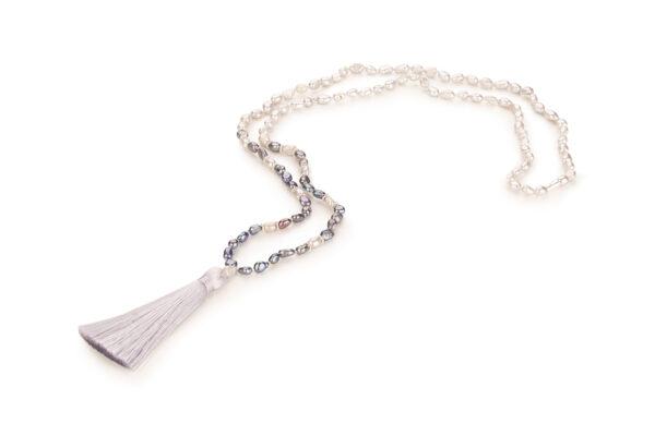 Spirituální mala s šedým střapcem, barokními perlami a stříbrnými komponenty upevňuje víru v životní hodnoty, kdy vše co se děje, děje se z vyššího principu. Spojení barokních perel odráží jedinečnost, půvab a sílu každé ženy.