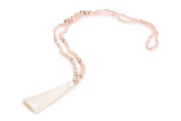 Spirituální mala s bílým střapcem je tady a teď, jako jediný okamžik kdy můžeme konat. Být v přítomném okamžiku je jediná pravda. Růženín je kamenem lásky, nejvyšší hodnoty. Perla odráží naší jedinečnost. Miluj bez podmínek a žij v přítomném okamžiku.