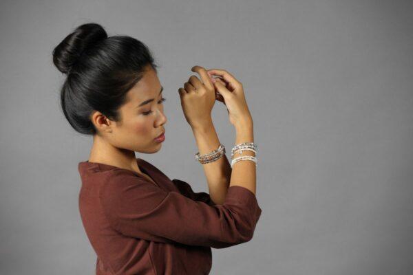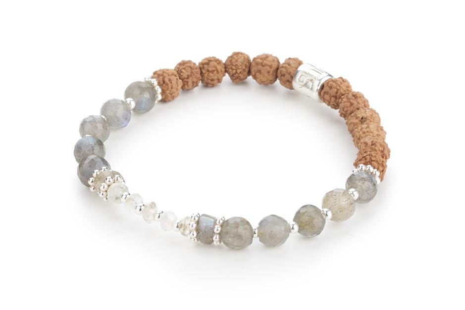Náramek z Rudakshi, akvamarínu a labradoritu se stříbrem vnáší světlo do života svého nositele. Snoubí se s jeho přirozenou moudrostí a věděním. Posiluje víru v sám sebe. Semeno Rudrakshi jakožto modlitební korálek v sobě odráží pozitivní energii a přenáší její působení. Labradorit je kamenem proměny a ochrany. Akvamarín podněcuje radost a přirozený klid.