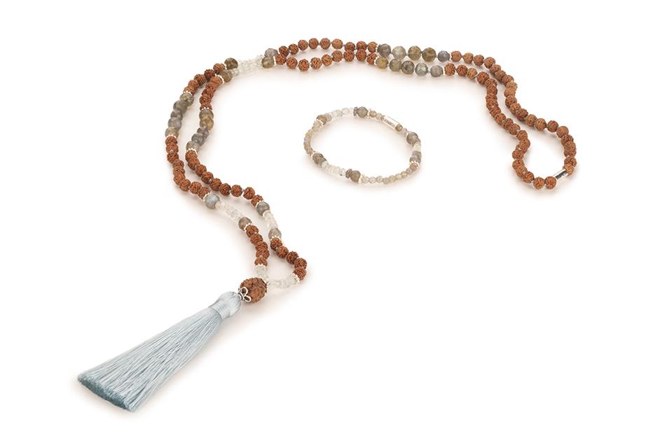 Spirituální set náramku z Rudakshi, akvamarínu a labradoritu vnáší světlo do života svého nositele. Snoubí se jeho přirozenou moudrostí a věděním. Posiluje víru v sám sebe. Semeno Rudrakshi jakožto modlitební korálek v sobě odráží pozitivní energii a přenáší její působení. Labradorit je kámenem proměny a ochrany. Akvamarín podněcuje radost a přirozený klid. Velikost náramku 17 cm.