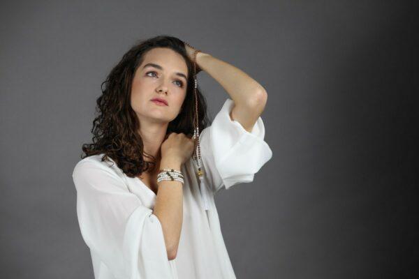 Náramek z magnezitu a hematitu se zlatým zapínáním, připodobňující všudypřítomné, všeobjímající a láskyplné božské světlo. Magnezit osvětluje vnitřní myšlenky, je jakýmsi zrcadlem nitra. Hematit přináší rovnováhu a ochranu.
