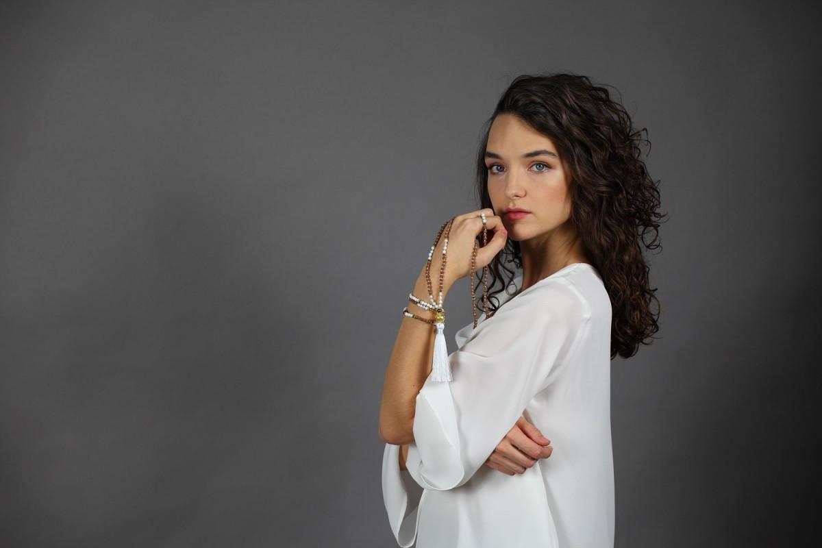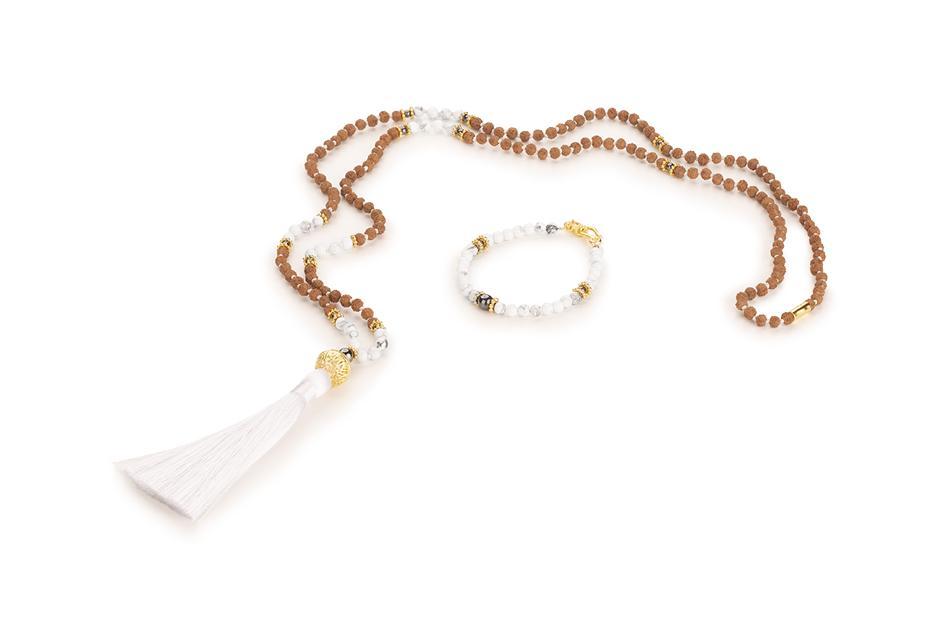 Spirituální set náramku a maly s bílým střapcem, Rudrakshou, magnezitem, hematitem a zlatým guru korálkem, připodobňující všudypřítomné, všeobjímající a láskyplné božské světlo. Semeno Rudrakshi jakožto modlitební korálek v sobě odráží pozitivní energii a přenáší její působení na nositele šperku. Magnezit osvětluje vnitřní myšlenky, je jakýmsi zrcadlem nitra. Hematit přináší rovnováhu a ochranu. Velikost náramku je 17 cm.