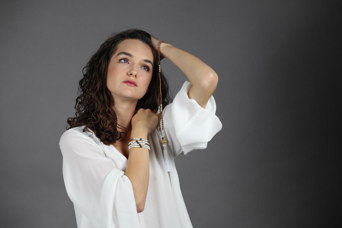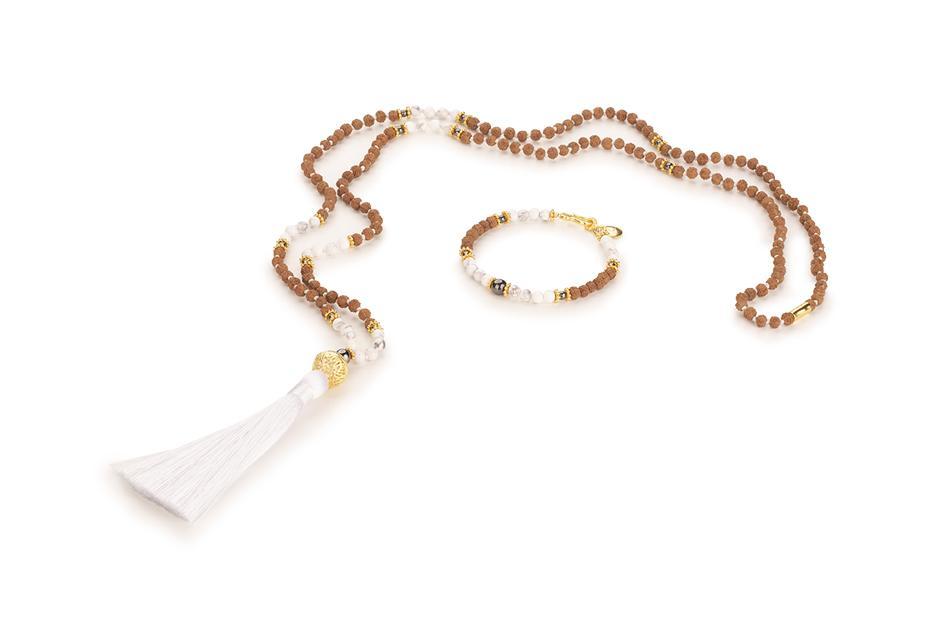Spirituální set náramku a maly s bílým střapcem s Rudrakshou, magnezitem, hematitem a zlatým guru korálkem, připodobňující všudypřítomné, všeobjímající a láskyplné božské světlo. Semeno Rudrakshi jakožto modlitební korálek v sobě odráží pozitivní energii a přenáší její působení na nositele šperku. Magnezit osvětluje vnitřní myšlenky, je jakýmsi zrcadlem nitra. Hematit přináší rovnováhu a ochranu. Velikost náramku je 17 cm.