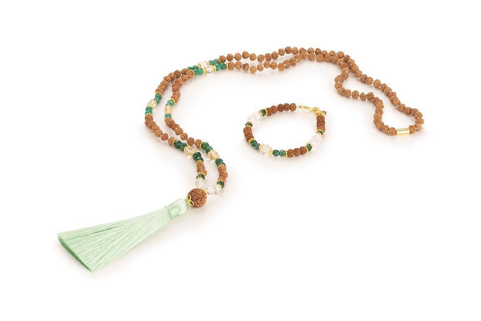 Spirituání set náramku a maly z Rudrakshi, křišťálu, zeleného onyxu a zlatého komponentu je připodobňován k chodidlům, kterými jsme spojeny s Matkou Zemí. Semeno Rudrakshi jakožto modlitební korálek v sobě odráží pozitivní energii a přenáší její působení na nositele šperku. Křišťál působí svou očistnou léčivou energií a zelený onyx přispívá k rozvoji a odstraňuje srach. Stane se Vaší přirozeností, stejně jako Země sama. Velikost náramku je 17 cm.
