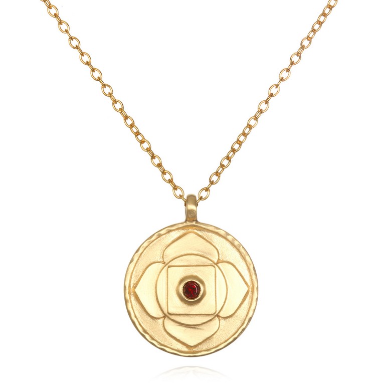První čakra, kořenová čakra – Muladhara – je napojena na podvědomí, formuje hranici mezi minulými a budoucími životy. První čakra pouští energii dolů do země, aby nás s ní spojila a dala nám sílu. Třpytivý červený kámen uvnitř zlatého lotosu ukazuje podstatu čakry. Vkročte do centra Vašeho vědomí. Probuďte svoje spojení se světem kolem Vás.