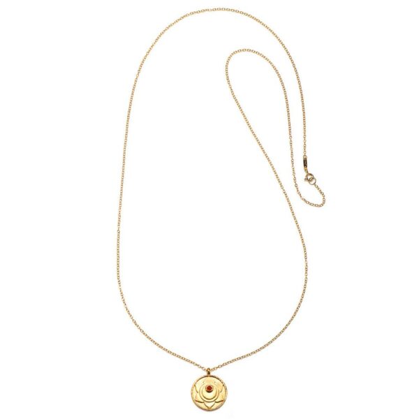 Druhá čakra, křížová – Svadhishthana – reprezentuje otevírání druhého stupně vědomí. Třpytivý oranžový kámen zasazený ve zlatém lotosu zobrazuje podstatu této čakry na nepřehlédnutelném náhrdelníku. Harmonizovaná druhá čakra pomáhá zbavit se nejistoty, přináší klid a vede mysl do vyššího stavu vědomí. Radost již na Vás čeká.