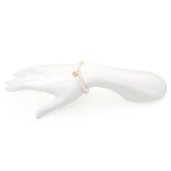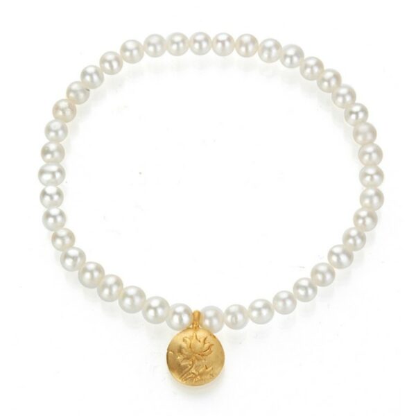 Klasický náramek z bílých perlel – symbolu upřímnosti, doplněný zářivým květem lotosu, který zdůrazňuje kouzlo a krásu nových příležitostí.